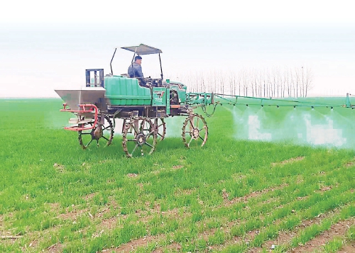 3月5日,河南省漯河市舞阳县田园前锋栽培合作社的麦田里正在进行“一喷三防”作业。材料图